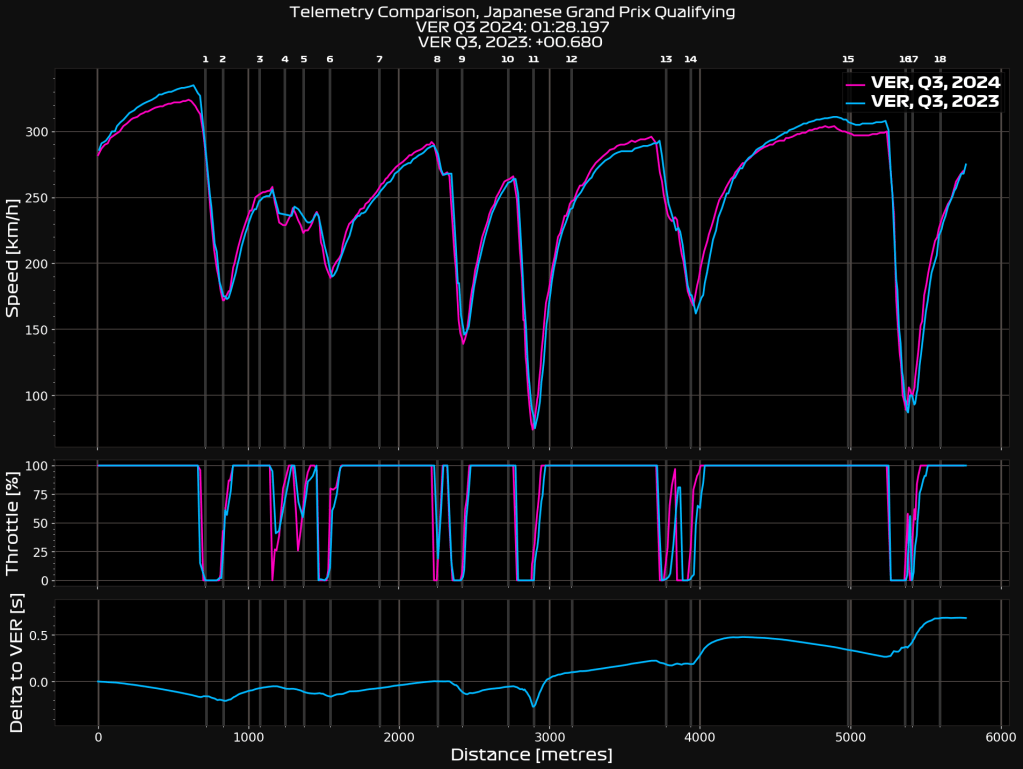 I can only compare it Max’s lap times in Australia 2023 and 2024, where most of his time gained was due to having a higher speed down the straights. In Bahrain 2023 vs. 2024, like Suzuka, the time appears to be coming out of slow speed corners, so perhaps we can conclude that the RB-20 is better in the traction zones than the RB-19 was. This, ultimately is only speculation.