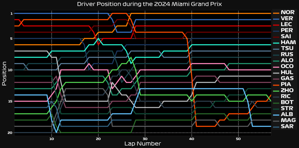 Verstappen started on pole and remained there, despite his teammate seemingly trying very hard to take him out at Turn 1 on the first lap. This lasted until he pitted for new tyres on Lap 23 during the Virtual Safety Car that came out after Max himself hit a bollard, resulting on the bollard-cum-debris being dangerously on the racing line on the long final straight. Piastri, who started sixth, made it up to second place, with Charles Leclerc and Carlos Sainz holding position behind him. An early pit stop for Perez put him down the order after having to deal with traffic, with Leclerc boxing later on 19. Piastri and Sainz both boxed on Lap 27, dropping them from P1 and P2 to P4 and P5 respectively, while McLaren decided Norris should go long on his first stint after starting 5th and so didn’t stop. They were hoping for a safety car, which given that a) we’ve had one in 50% of the previous (admittedly two) Miami GPs, and b) it actually happened, seemed like a good strategy. If you bet on a Williams crashing in a grand prix weekend in 2024, you can seemingly make some easy money.