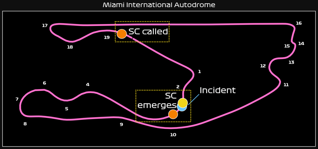 That is to say, the safety car should not aim to come out just in front of the leader of the race and just behind lapped car in front of the leader. Rather, it comes out instantly, catching whatever the cars happen to be behind it. In this case, Norris was just in front of it when it came out, while Verstappen was just behind it. In my ‘expert analysis’ of the Sky Sports Extended Highlights; without any cuts in the broadcast footage, the safety car came 17 seconds after the incident between Magnussen and Sergeant first happened, while Norris was on the pit straight. If you check my map below, you can see exactly where Norris was when the safety car was first called and where he was when it emerged on track.