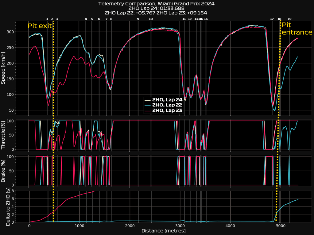 If you check Zhou’s telemetry below, Lap 24 is a non-VSC lap, while laps 22 and 23 are the beginning and ending VSC laps, respectively. The delta section measures the difference to Lap 24, i.e. to the non-VSC lap, so we can see the effect of a VSC on lap time. On lap 22, when the VSC was called, Zhou loses roughly two seconds between Turn 18 (roughly at the level of the pit entrance) and the end of the lap. On lap 23, when the VSC ends, he loses three to four seconds between the start of the lap and Turn 2, where the pit exit is. So in total, between 5 and 6 seconds.